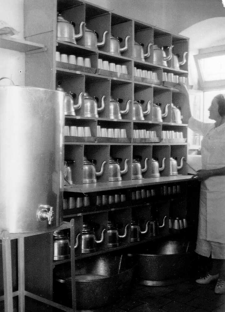 החלב בכיתות. נושא המגש מחלק את הכוסות לכל ילד ונושא הקומקום עובר בין הספסלים