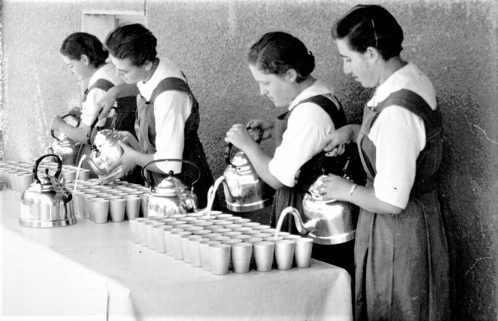 אחיות בית הספר מוזגות חלב לכוסות, 1945 בקירוב (PHG\1015293)