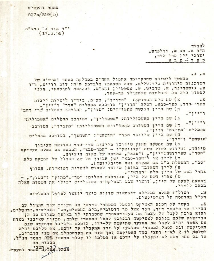 מכתב סיכום פגישה של נחום תשבי, מנהל מחלקת מסחר ותעשייה עם משפחת וולפרט ובו מפורטים שמות היינות השונים שהוחלט לקרוא ליינות השונים מפירות הדר, 17.3.1938 (S8\2292\1)