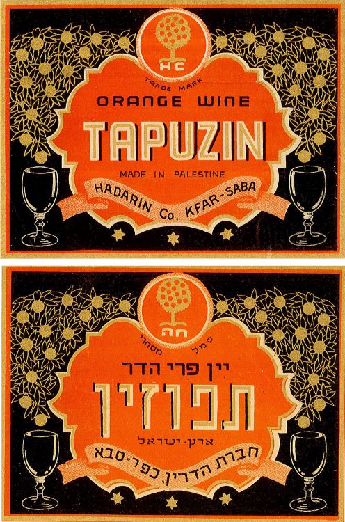 תוויות של יין תפוזים שיוצר על ידי חברת הדרין, כפר סבא, 1938 (S8\2292\1)