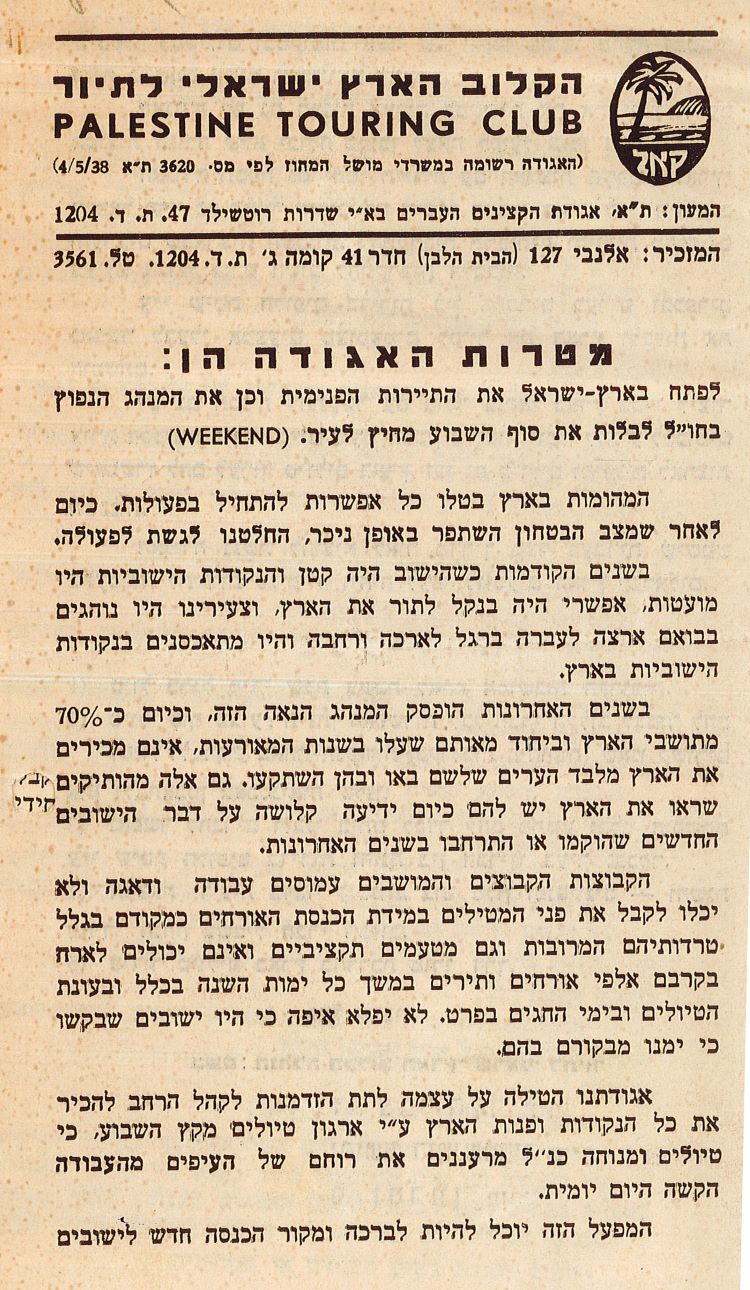 עלון פרסומת של "הקלוב הארץ ישראלי לתיור", שנות ה-40 (S8\215)