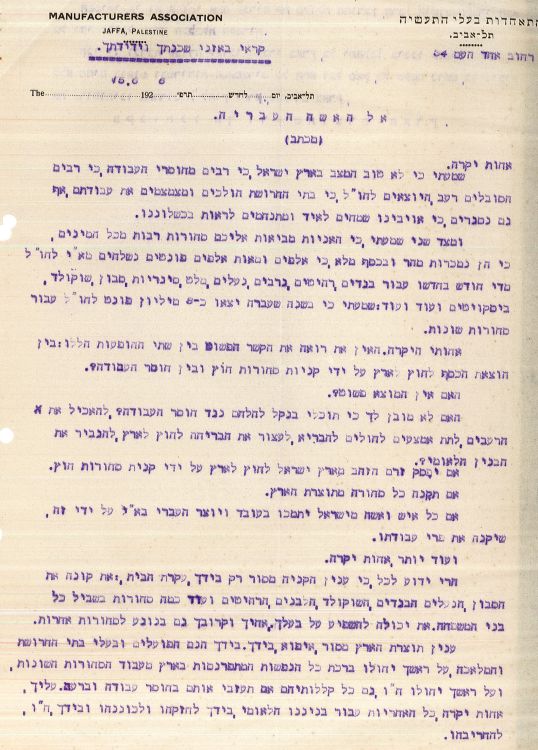 פנייה של התאחדות בעלי התעשייה אל האישה העברייה, יוני 1926 (S8\2276\1)