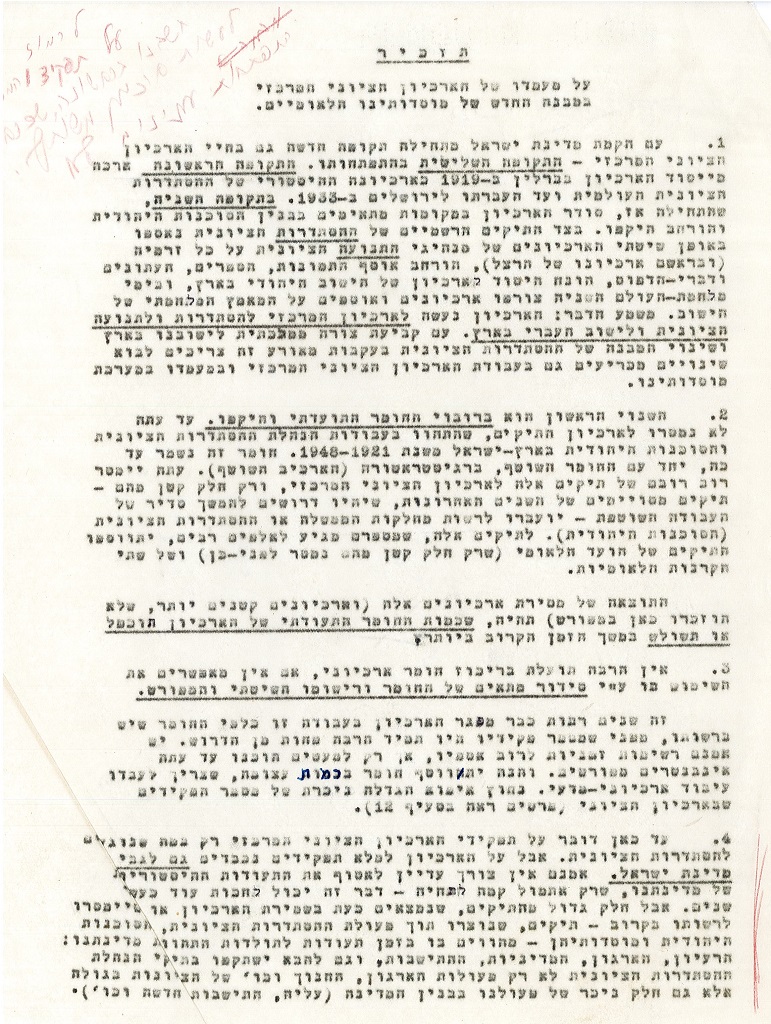 בתקופת היישוב גם תחת ממשלת ישראל. מנהלי הארכיון הציוני פירטו בתזכירם את מעמדו ואת