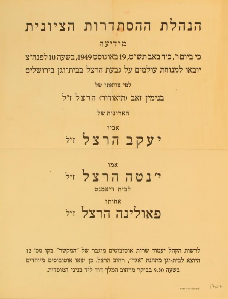 "על גבעת הרצל בבית וגן" – כרוז המודיע על טקס הקבורה