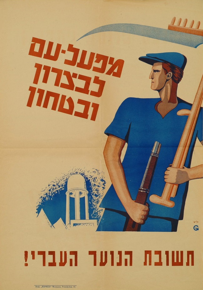 כרזה נוספת של וליש: "מפעל עם לבצרון וביטחון. תשובת הנוער העברי!"