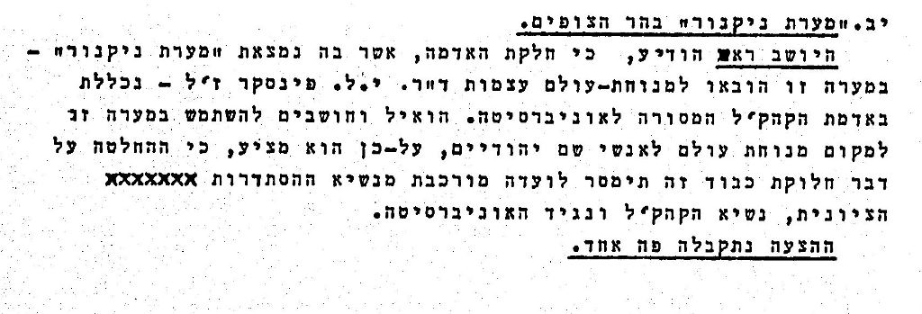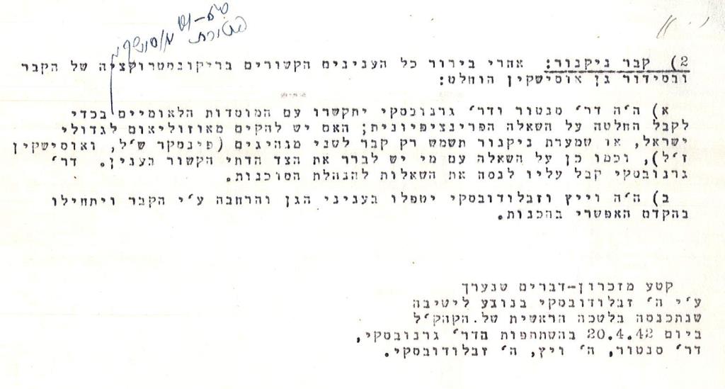 זיכרון דברים מישיבת קק"ל שבה נדונה השאלה האם להקים במערת ניקנור מאוזוליאום לגדולי ישראל או שתשמש את קברם של פינסקר ואוסישקין בלבד, 20.4.1942 (KKL5\60074)