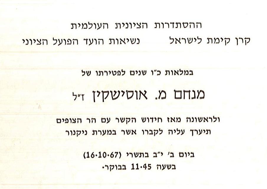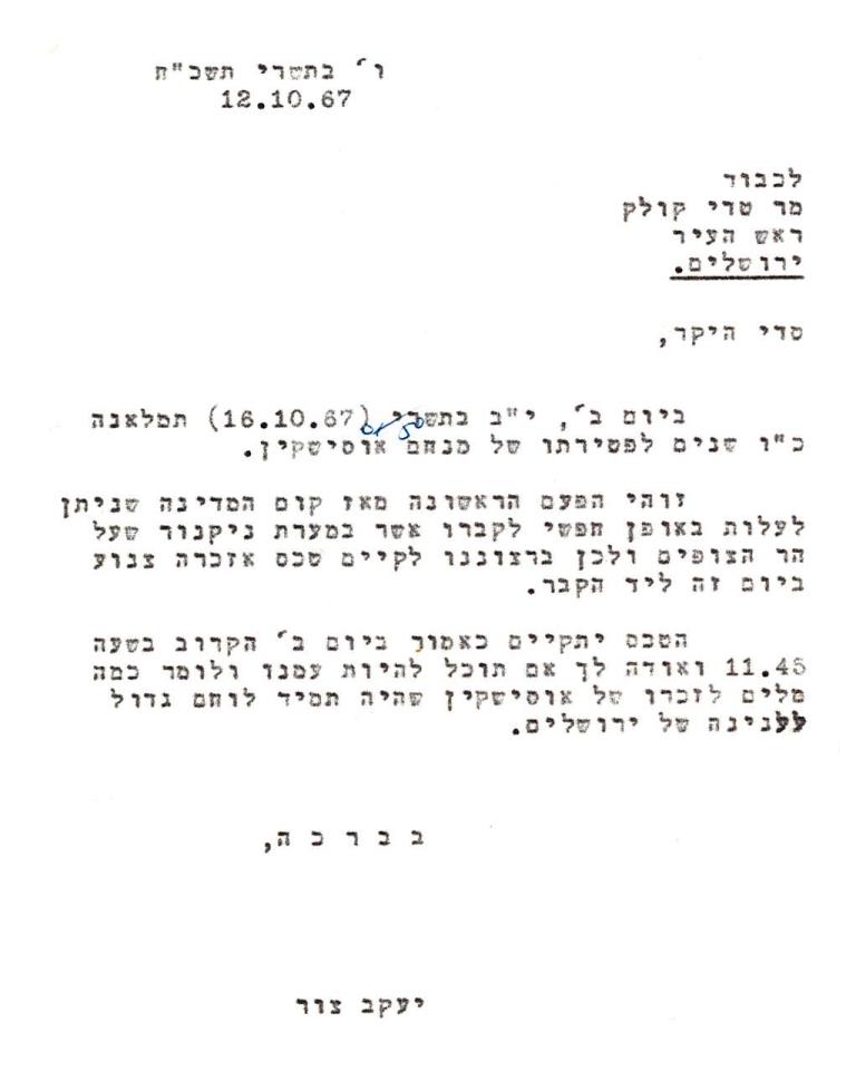 הזמנה לטדי קולק להשתתף באזכרה לאוסישקין, 12.10.1967 | הזמנה לעלייה לקבר של אוסישקין לאחר חידוש הקשר עם הר הצופים, 16.10.1967 (KKL5\60074)