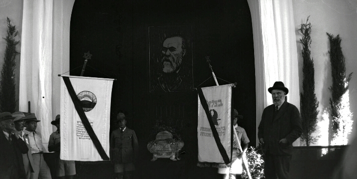 הלוויתו של יהודה לייב פינסקר, מנחם אוסישיקין עומד ליד הארון, יוני 1934. צילום: צבי אורון (NZO\631073)