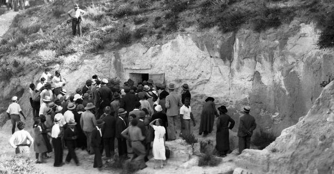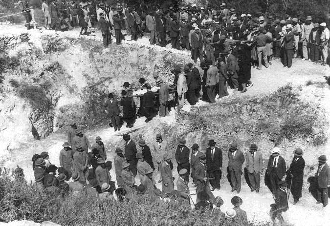 הלוויתו של יהודה לייב פינסקר במערת ניקנור, הקהל בפתח המערה, יוני 1934. צילום: צבי אורון (NZO\631079)