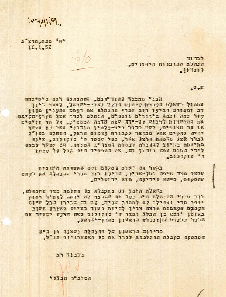 מכתב מהמזכיר הכללי של הנהלת התנועה הציונית בארץ ישראל אל הנהלת התנועה הציונית בלונדון, 7.9.1933 (S25\1355)