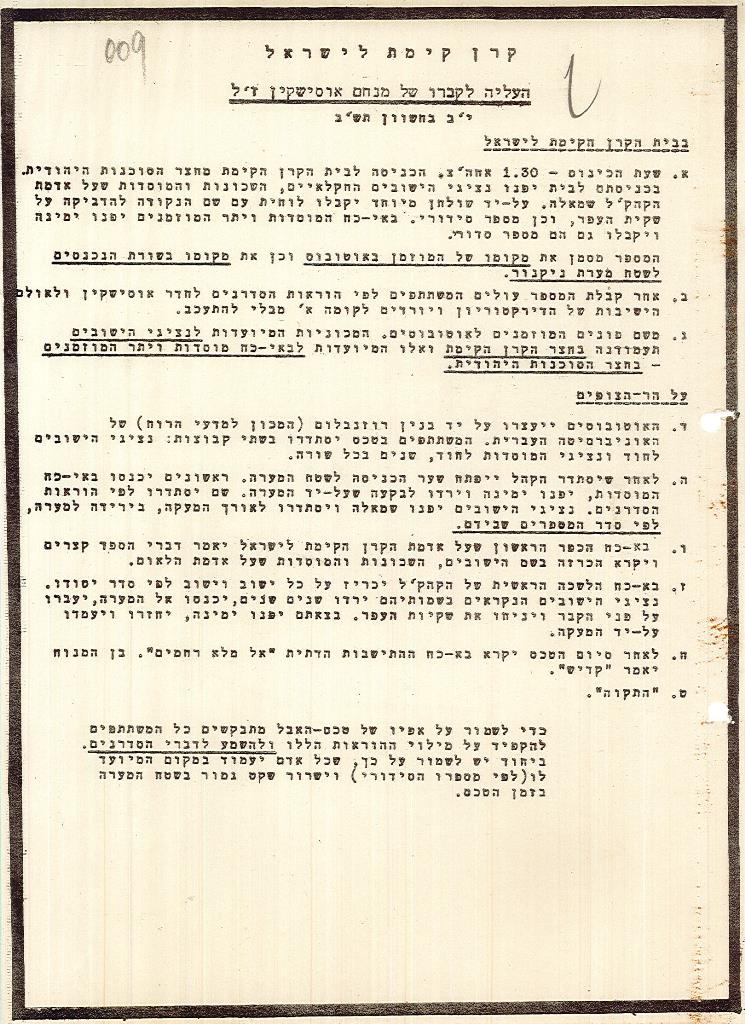 העליה לקברו של אוסישקין לאחר 30 יום למותו, פירוט טקס האזכרה, 1941 (S53\34\1)