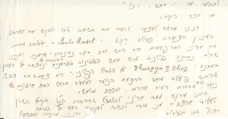 מכתב ששלח וולך אל יהושע בכר בנוגע לפאולה ראבט, 13.6.1939 (A399\714-1t)