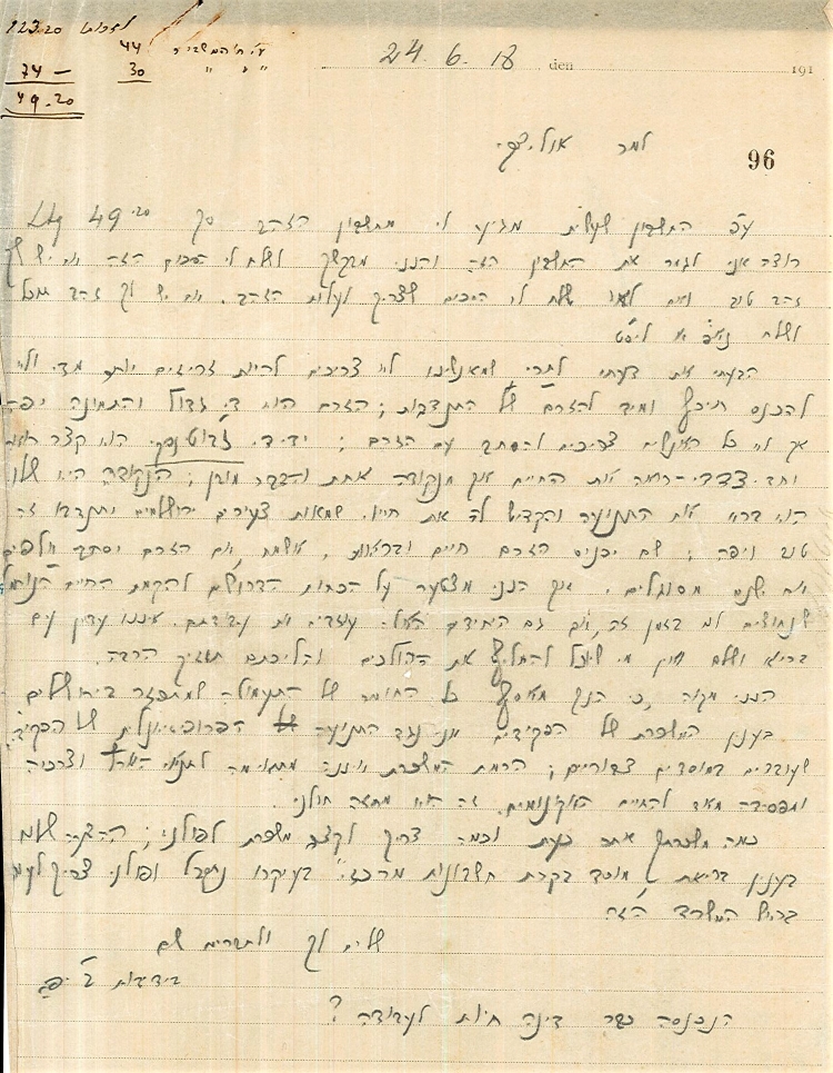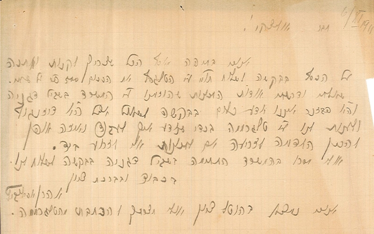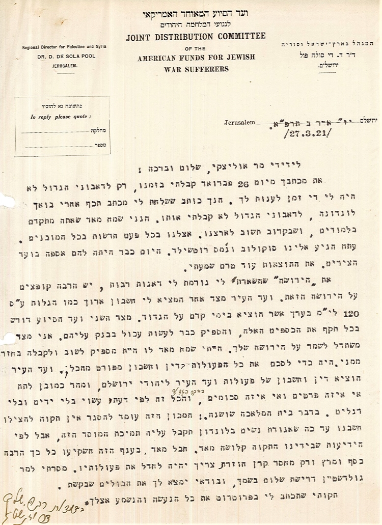 יודילוביץ אל אוליצור בעניין העברת כספים מהמשרד הארץ-ישראלי אל קבוצת דגניה,