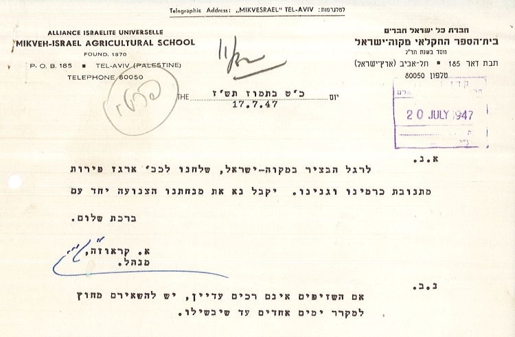 מנהל מקוה ישראל, לאוליצור, 17.7.47 (A195\37)