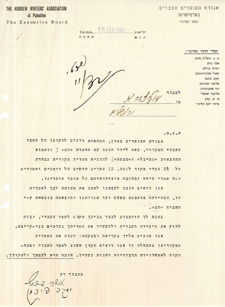 הסופרים העברים בארץ ישראל" לאוליצור בבקשה לרכישת מנוי לספרים נבחרים, 18.2.1934 (A195\46)