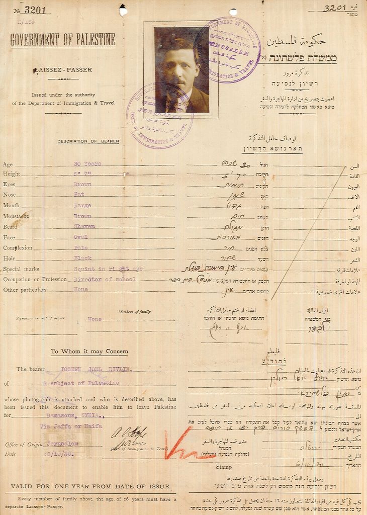 רישיון נסיעה של יוסף יואל ריבלין עם תיאור