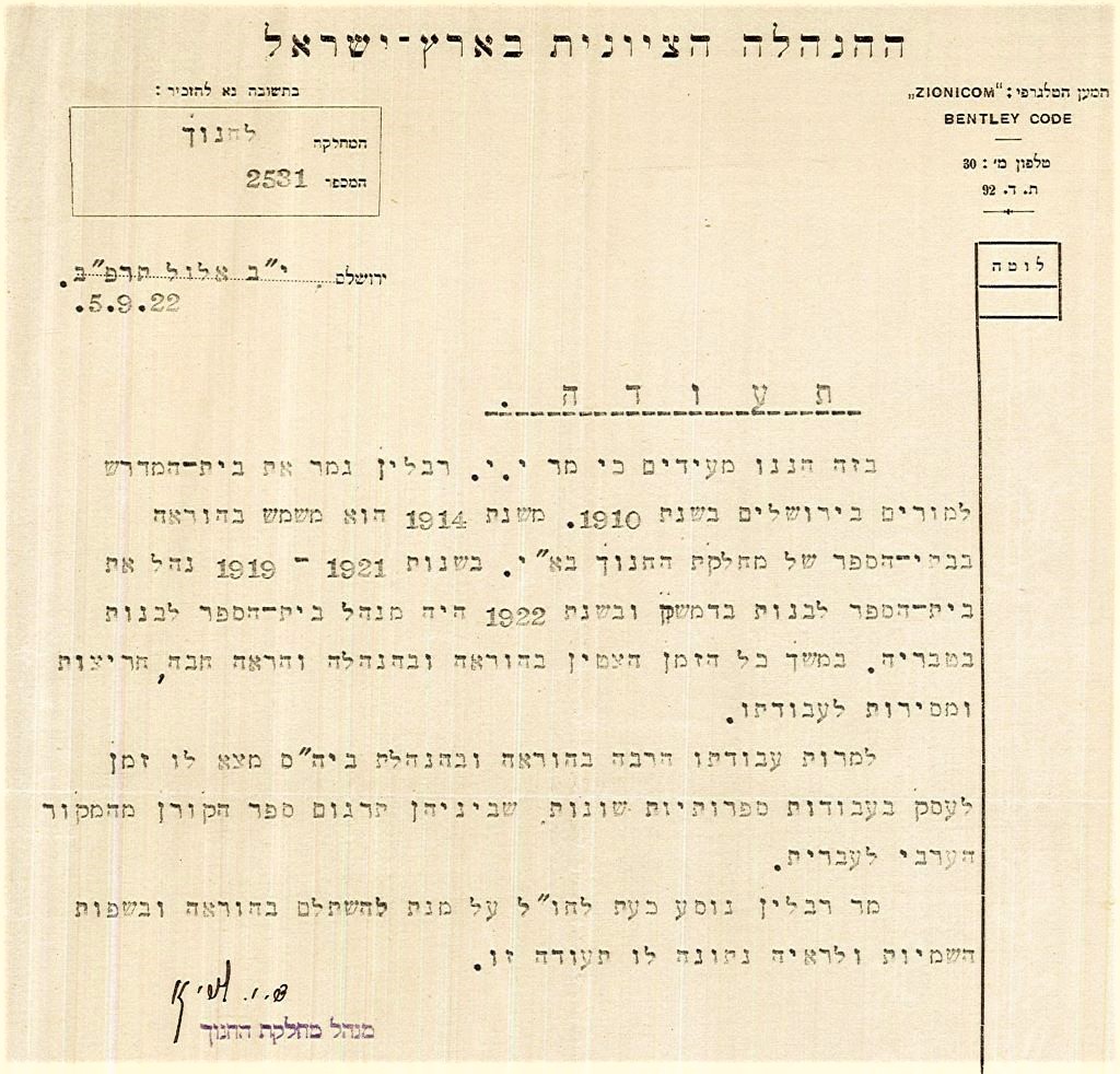 החינוך של ההנהלה הציונית. לימודיו סייעו לו במפעל תרגום הקוראן לעברית בהוצאה של
