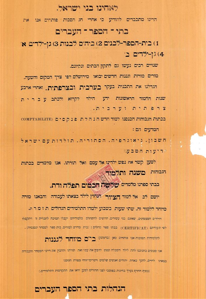 הודעה על פתיחת בתי ספר עבריים בדמשק,
