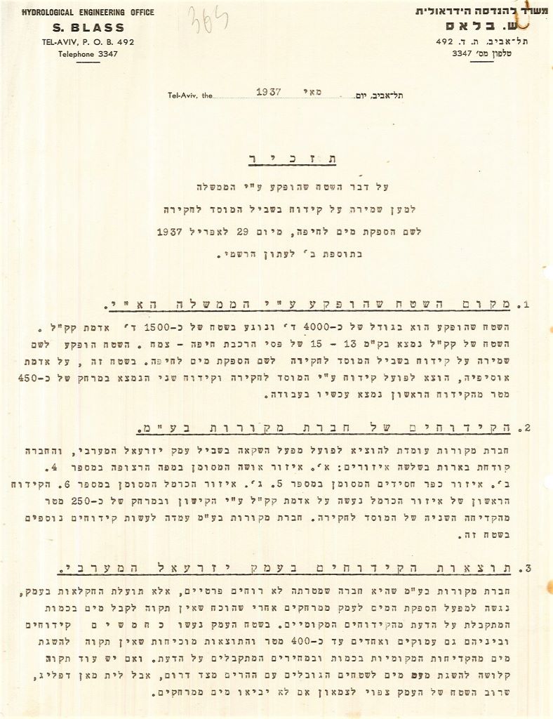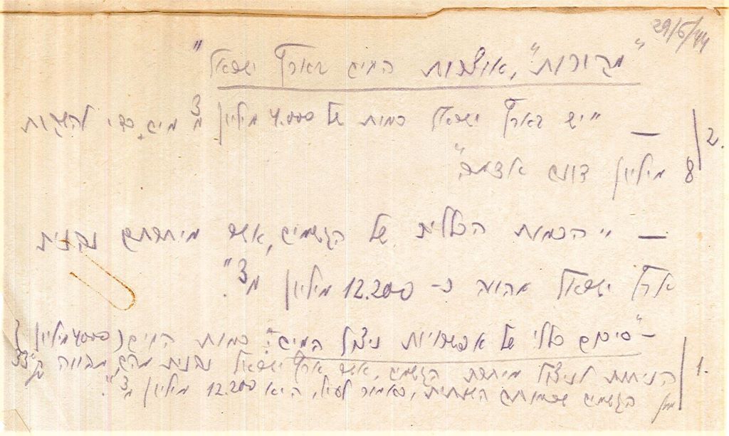 תזכיר "השלב הראשון לפתוח ארצי של מקורות המים" בחתימת בלאס ובו סקירה של החומרים הנדרשים למפעלי המים השונים בארץ ישראל ומחירם, תל-אביב, יולי 1944 (2\S53\952)