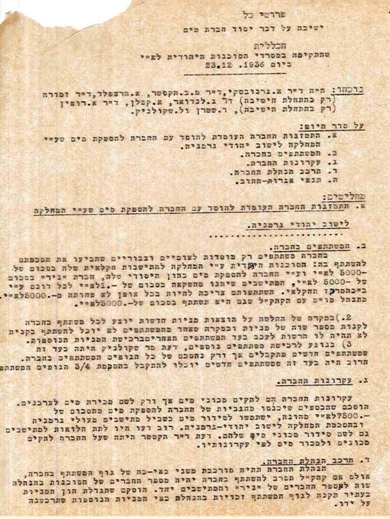 פרוטוקול ישיבה על דבר יסוד חברת מים, 23 בדצמבר, 1936 (KKL5\12739)