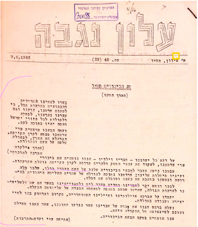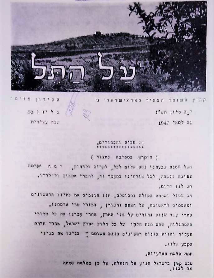 "חג הבית והבכורים" מתוך "על התל": יומן קבוץ השומר הצעיר הארצישראלי ג' (חצור) מס' 30, י"ב סיון תש"ז, אצ"מ, עלוני הקיבוצים, מיכל מס' 30114.