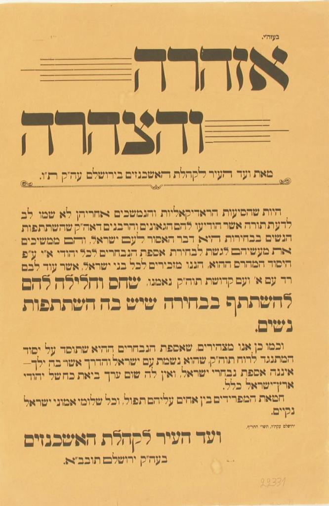 ועד העיר לקהילת האשכנזים מתריע מפני השתתפות בבחירות בהשתתפות נשים (KRU\20895)