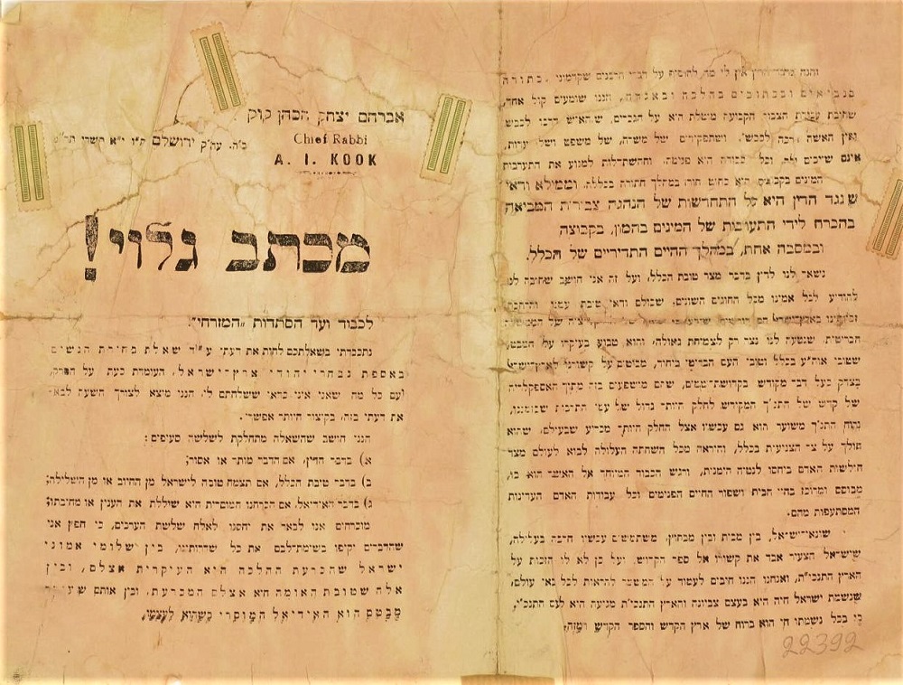 מכתב גלוי של הרב קוק אל ועד הסתדרות המזרחי, נגד לקיחת חלק בבחירות בהשתתפות נשים (KRU\20956)