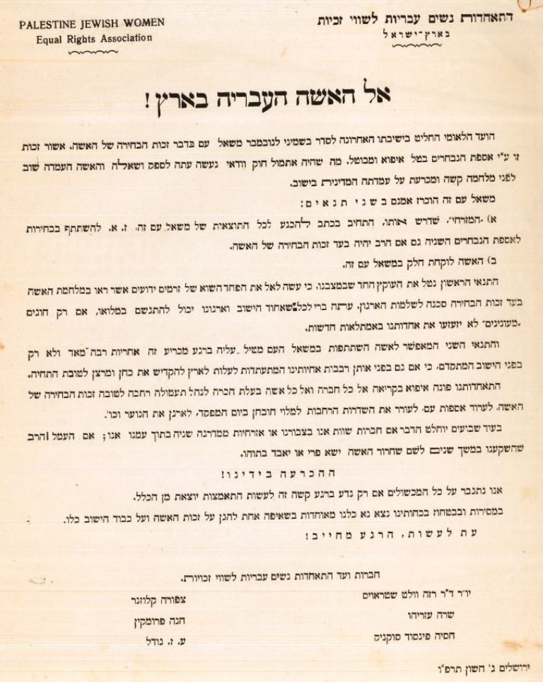 הצהרת התאחדות נשים לשווי זכויות בארץ ישראל בדבר קיום משאל העם. "מה שהיה אתמול חוק וודאי נעשה עתה לספק ושאלה והאשה הועמדה שוב לפני מלחמה קשה ומכרעת על עמדתה המדינית ביישוב". (J75\7)