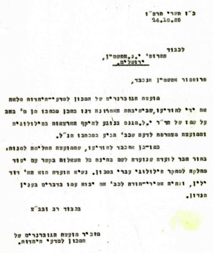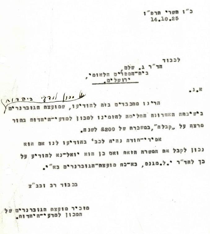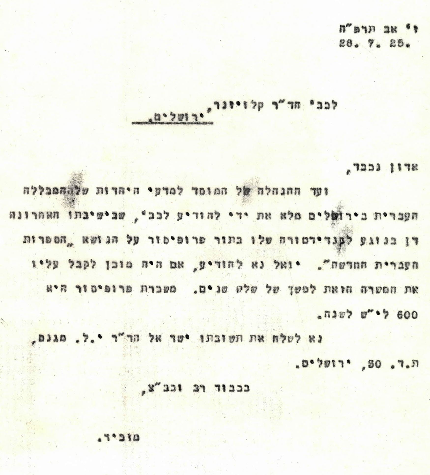 ד"ר יוסף קלויזנר, ההיסטוריון וחוקר הספרות, התקבל כפרופסור ל"ספרות העברית החדשה". ד"ר גרשום שלום, מגדולי חוקרי הקבלה, התקבל כמרצה לקבלה. פרופ' יעקב נחום אפשטיין, מייסד המכון למדעי היהדות, מתבקש במכתב להצטרף לוועדה שנועדה להקים מחלקה חדשה ל"מחקר פילולוגי עברי" (חקר השפה העברית). פרופ' דוד ילין, ממקימי מכללת דוד ילין להכשרת מורים וחוקר עברית, התקבל כמרצה ל"ספרות העברית בתקופה הספרדית".