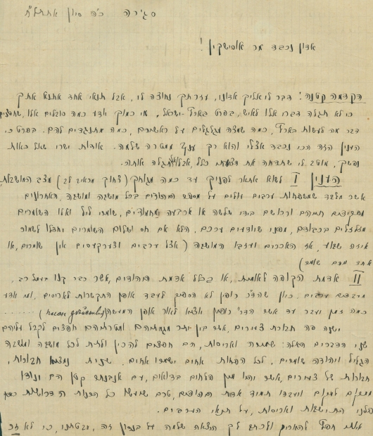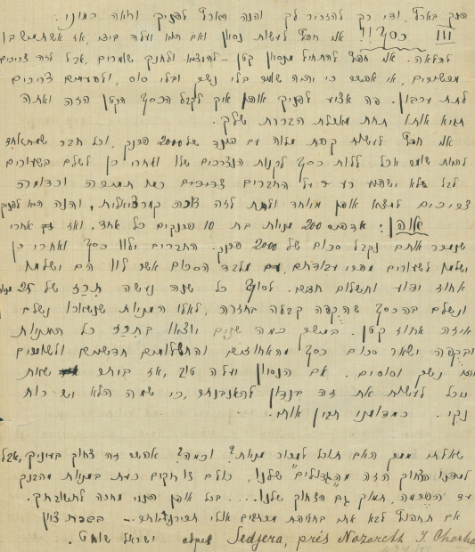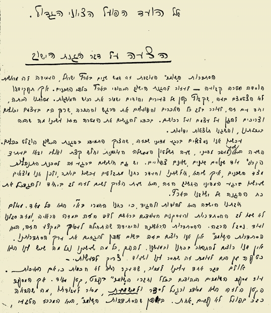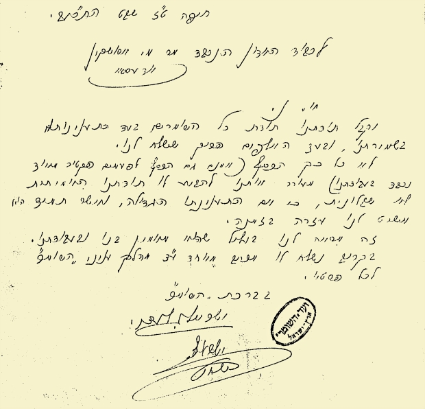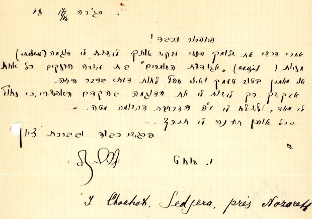 המאה: מכתב בן שני עמודים מישראל שוחט אל מנחם אוסישקין בדבר מימון ארגון שמירה