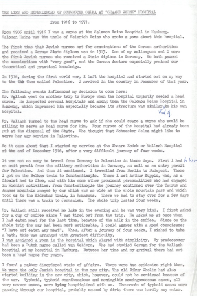 דף ראשון מתוך הטיוטה של זכרונותיה של זלמה מאיר מעבודתה בבית החולים שערי צדק (A613\10)