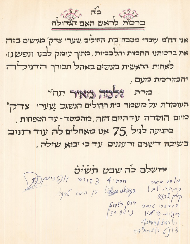ברכה מרופאי ואחיות שערי צדק לרגל יום ההולדת השבעים וחמש של האחות זלמה (A613\6)