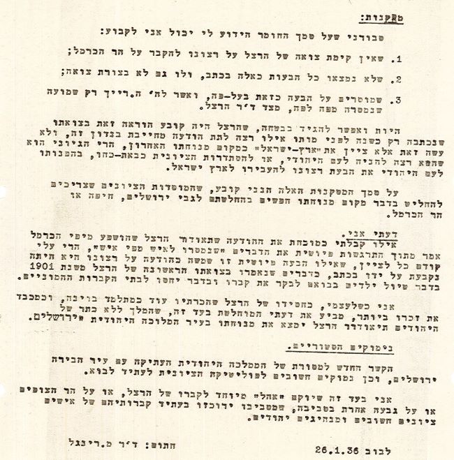 דו"ח שכתב ד"ר מיכאלך רינגל, יו"ר הוועדה להעברת עצמות הרצל, 1936 (S25\1355)