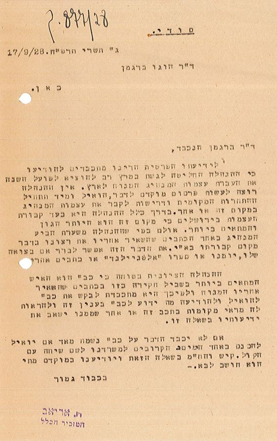 מכתב של ההנהלה הציונית להוגו ברגמן, 1928 (S25\1355)