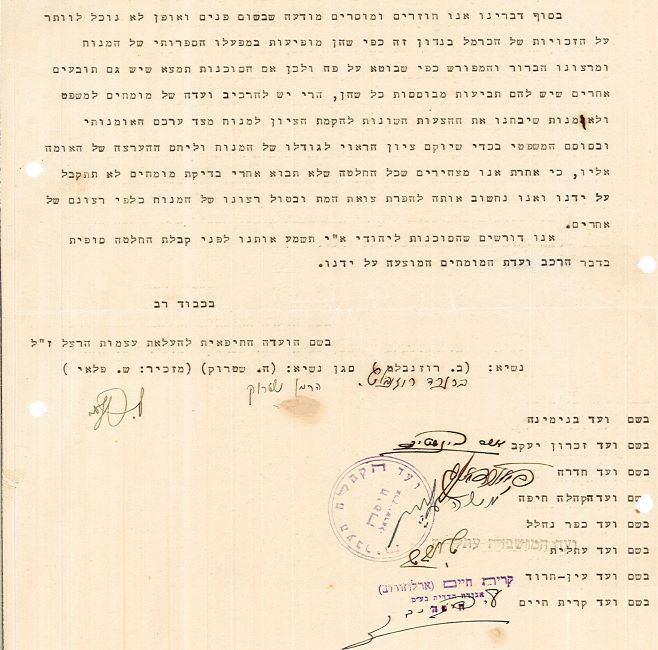 מכתב של הוועדה החיפאית להעלאת עצמות הרצל ובו העלו את הטענות לקבירת הרצל בהר הכרמל, 1934 (S25\1355)