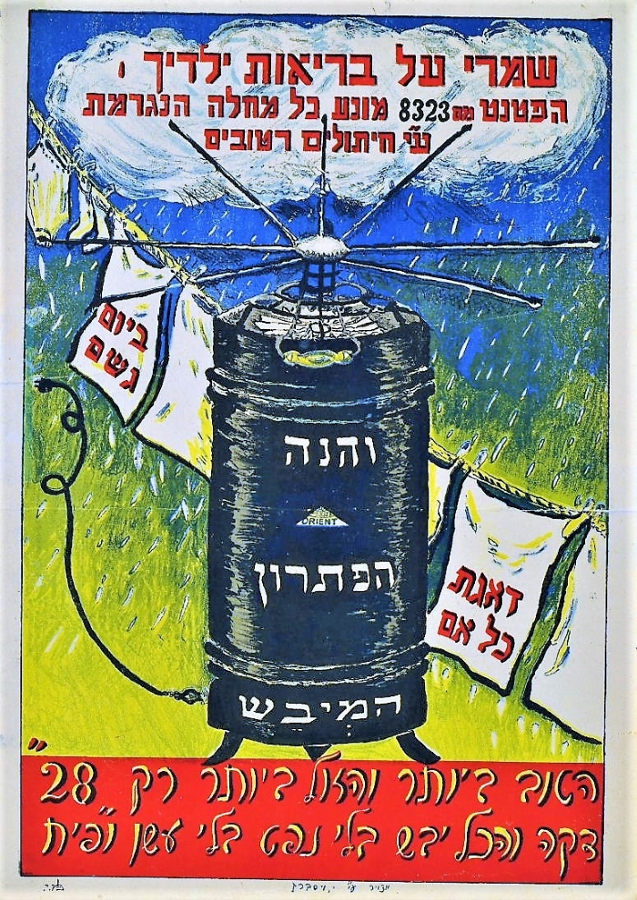 הראש היהודי ממציא לנו פטנטים כמו ההמצאה הזו: מייבש חיתולים. בתקופה, שבה השתמשו בחיתולי בד לתינוקות, עונת החורף הייתה מאתגרת. ההמצאה הזו נועדה לייבש את הבדים במהירות – ייבוש שעזר גם לאימהות וגם היה בריא לילדים. ציור של י. ויסברג. (KRA2075)
