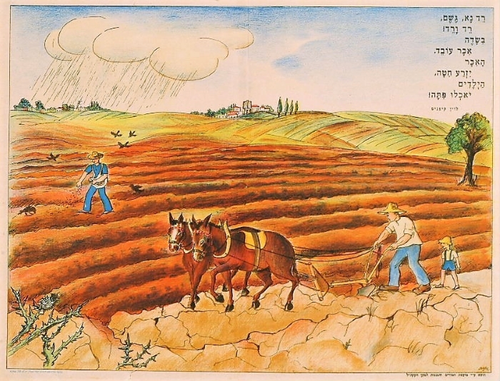 "גשם רד". את הכרזה עיצבה המאיירת איזה הרשקוביץ, ובה מופיעים זה לצד זה שדות חקלאיים ויישוב עירוני