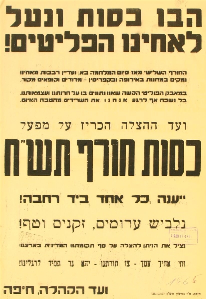 נזקקים נוספים, שהיו זקוקים לעזרה בחורף היו מגורשי קפריסין. ניצולי שואה ומעפילים חיו במחנות בקפריסין ללא אמצעים וללא תמיכה. ועד ההצלה החליט לערוך בקרב תושבי הארץ מגבית עבורם על מנת ש"נציל את הניתן להצלה על סף תקומתנו המדינית בארצנו!". הכרוז פורסם בסתיו 1947 בחיפה. (KRU\12951)