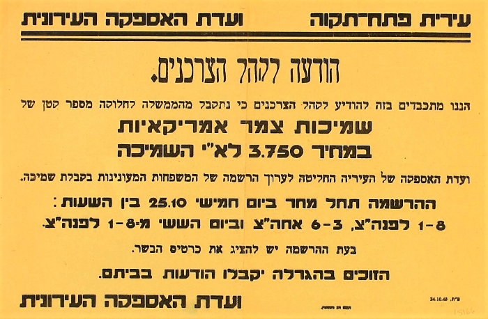 ועדת האספקה של עיריית פתח תקווה פרסמה בסתיו 1945 הודעה לקהל הצרכנים על מכירה של מספר מצומצם של שמיכות צמר אמריקאיות, שהגיעו לארץ. ככל הנראה לשמיכות הללו היה ביקוש רב מכיוון שבין המעוניינים לרכוש אותן נערכה הגרלה מיוחדת. הזוכים המאושרים קיבלו הודעות לביתם. (KRU\15166)