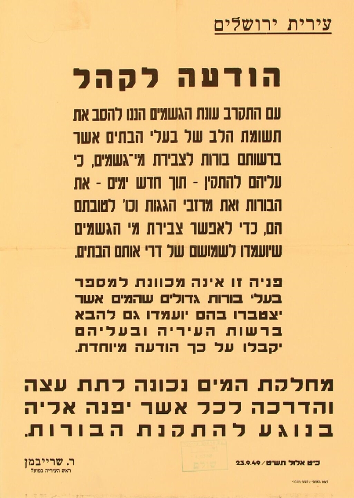 היו זמנים, שבהם נחפרו בורות מים ליד הבתים כדי לאגור את מי הגשמים. לקראת החורף בעלי הבורות היו צריכים להכין את הבורות ואת אמצעי הניקוז כדי לאגור את מי הגשמים בצורה מיטבית. במהלך הסתיו דאגה עיריית ירושלים להזכיר לבעלי הבורות להתכונן לחורף, ואף הציעה את עזרתה למי שזקוק לכך. הכרוז פורסם בשנת 1949. (KRU\3428)