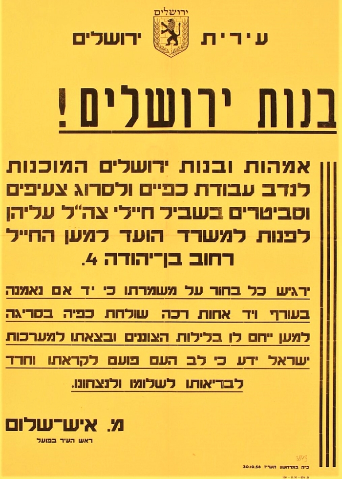 אין כמו לפנק את החיילים שלנו – במיוחד בימים הקרים. עיריית ירושלים יצאה בקריאה נרגשת לבנות ירושלים לסרוג צעיפים וסוודרים ("סביטרים" כלשון הכרוז) בשנת 1956 כדי לבטא את התמיכה ואת הדאגה של העם לשלומם. (KRU\3843)