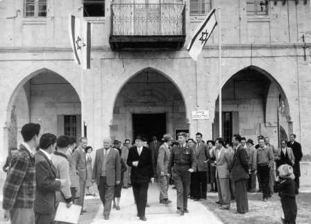 יצחק בן- צבי, נשיא המדינה, מבקר בעיר באר שבע. הנשיא, בליווי ראש העירייה, יוצא מבניין העירייה. 1953 (PHG\1014737)
