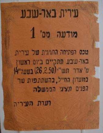 בין הכרוזים מוצגת מודעה המתעדת ראשית פעילותה של עיריית באר שבע: מודעה מספר 1 מזמינה את הציבור לטקס פתיחה חגיגי של העירייה שנערך במועדון החייל בפברואר 1950. על הכרוז שהיה שמור במרתפי הארכיון למעלה מחמישים שנה, ניכרו שיני הזמן. שאריות הכרוזים שהודבקו לפניו על לוח המודעות ונותרו על צידו האחורי, פגעו במודעה והשולים החלו להיקרע. כדי להכין אותו לתצוגה נדרשה עבודת שימור מקיפה. רמי, מנהל מעבדת השימור של הארכיון הציוני, המיס את הדבק והסיר את השאריות שנדבקו אל שולי המודעה, שיקם את הנייר, ויצר שוליים חדשים לכרוז. התהליך, שלקח כמה שעות טובות, הושלם בהצלחה ואת התוצאה אתם יכולים לראות כאן לפניכם.