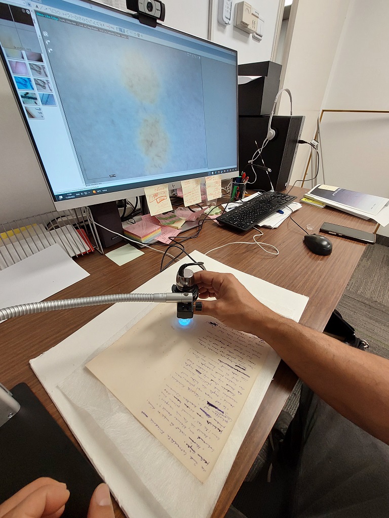 אבחון הכתמים בעזרת הדינו-לייט. ייתכן ומדובר בכתמי משקה שהפכו חלק מן ההיסטוריה... עמ' 48