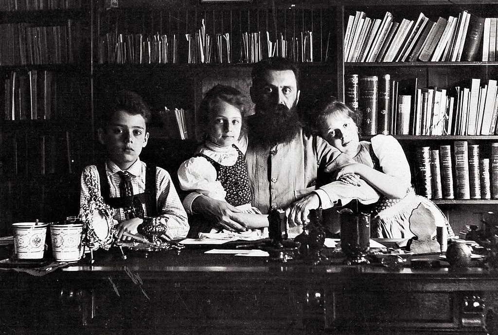 הרצל ליד שולחן הכתיבה יחד עם ילדיו פאולינה, טרודה והנס. מארכיון ליאון קלנר. (A74\27-7p)