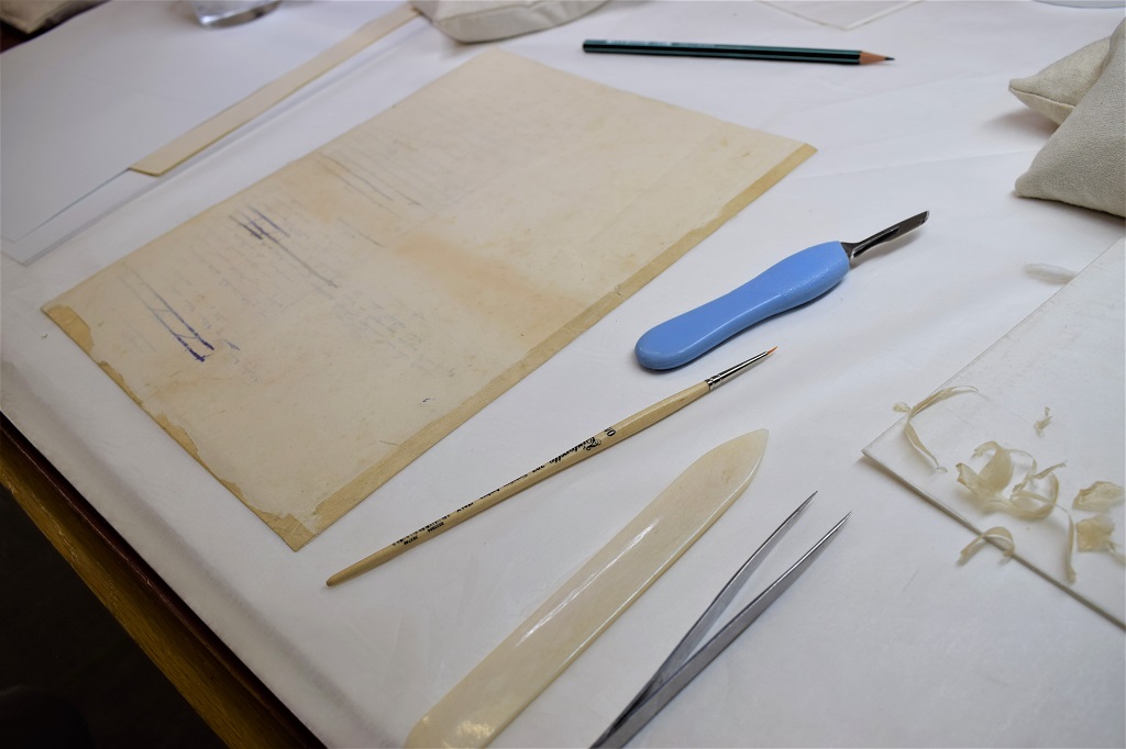 עטיפת כתב היד של 'אלטנולינד' בתהליך הטיפול - לפני הסרת דבק הנייר החום (קראפט) ולאחריו.