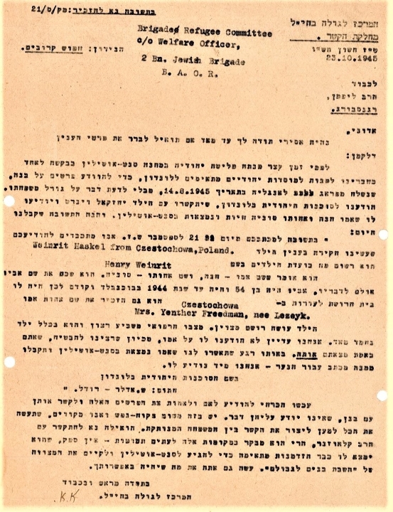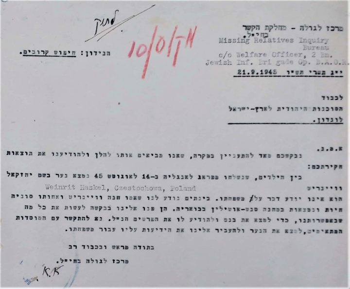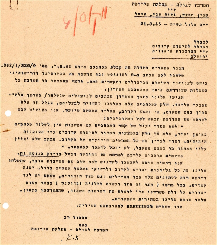 מכתב מ"המרכז לגולה" אל "המדור לחיפוש קרובים", 21.8.1945 (J12\174)