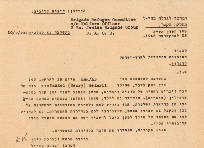 מכתבים ששלח "המרכז לגולה" למשרדי הסוכנות בלונדון ולרב ליפמן, לאחר שהבן יחזקאל נמצא באנגליה, 23.10.1945 (J12\174)