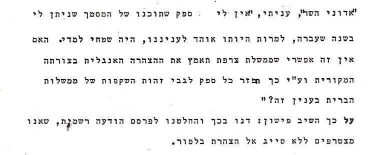 קשורה בניצחון בעלות הברית. הריני שמח לתת בזה הבטחה כזו. בכבוד רב".