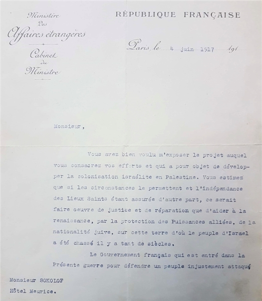 המכתב של ממשלת צרפת כלל תמיכה רשמית ראשונה בהתיישבות יהודית